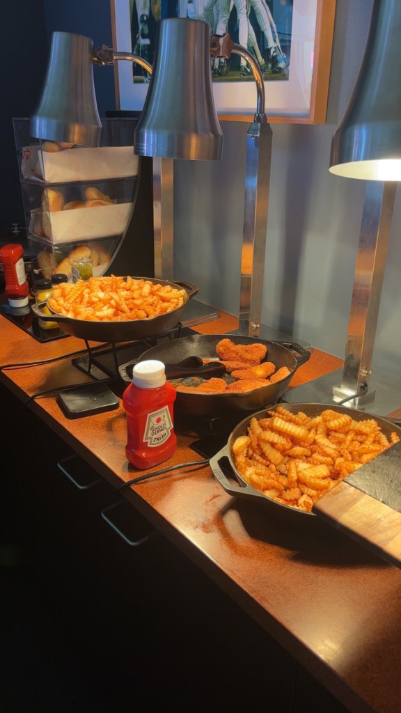The food tray gets set up for the fans to enjoy. Some of the food options that were available included chicken fingers, french fries, hotdogs, salad, and steak sandwiches.