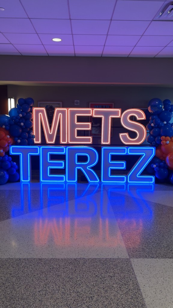 The Mets-Terez glow-up sign is located in the middle of the Suite Section hallway. This display represents the collaboration that the Mets and the MLB have with the women’s clothing brand.